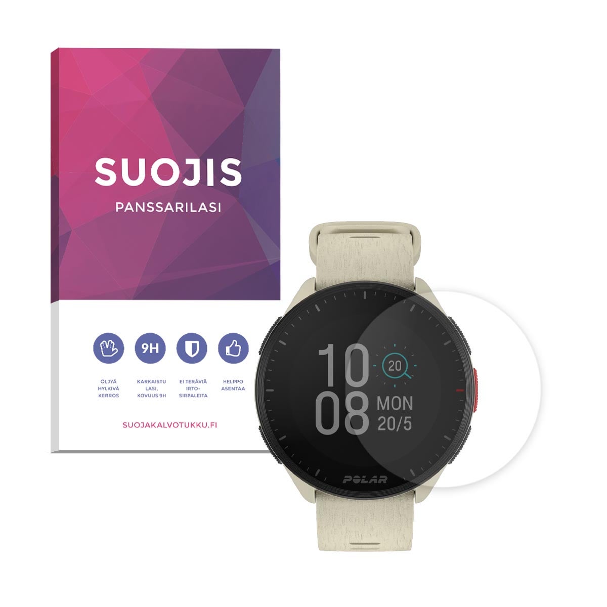 Polar Pacer klassinen Suojis®-panssarilasi on tehokas suoja, joka asettuu kellosi näyttöön ja säilyttää sen alkuperäisen kosketusherkkyyden. Materiaali on aitoa japanilaista AGC-lasia. Tämä laadukas 9H-vahvuinen ja vain 0,33 mm:n paksuinen panssarilasi on helppo kiinnittää, poistaa ja pitää siistinä.