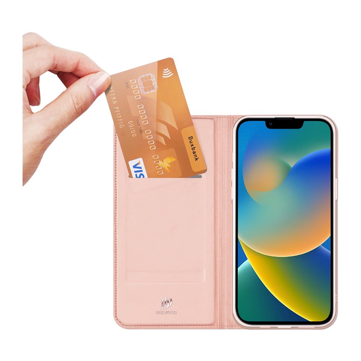 Dux Ducis Skin Pro keinonahkaiset kuoret iPhone 14 Plus -puhelimelle, luottokorttipaikalla kuvien mukaisissa väreissä.